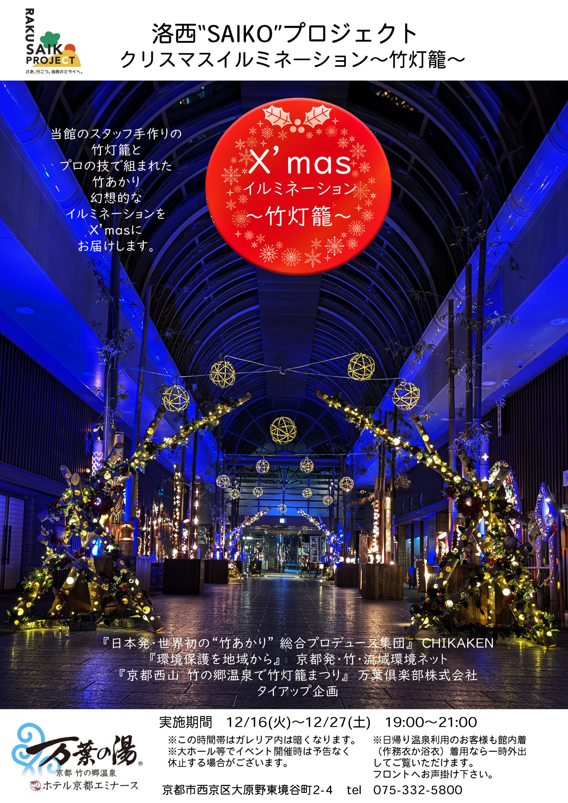 TOP 新着情報 竹灯籠イルミネーション(クリスマスver)開催中!! What's New新着情報 竹灯籠イルミネーション(クリスマスver)開催中!! 竹灯籠イルミネーション(クリスマスver)実施中!! 期間中、12月19日(金)のみ開催しておりません。 トップへ戻る カテゴリー すべて お知らせ 宿泊 京都竹の郷温泉 万葉の湯 レストラン・お食事処 宴会・会議