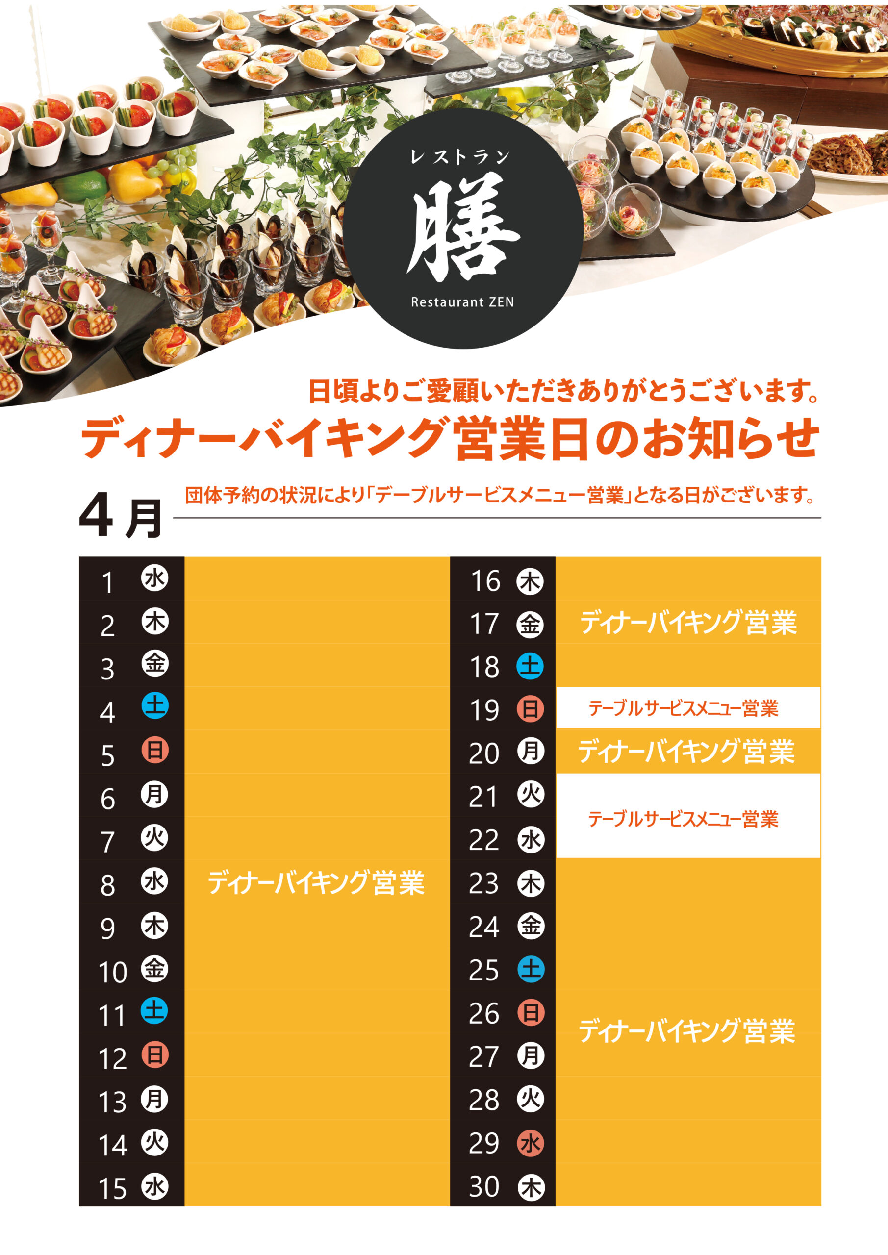 3月・4月のディナーバイキング/朝食バイキングのスケジュールをお知らせします。